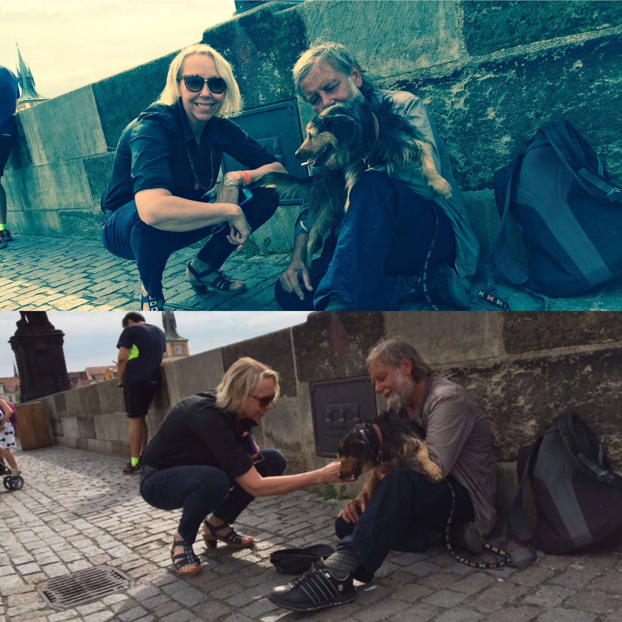 We dont give money, we treat on the place. There are most of the time a “soup kithchen” for the people, and those I went to, their dog could also join them.