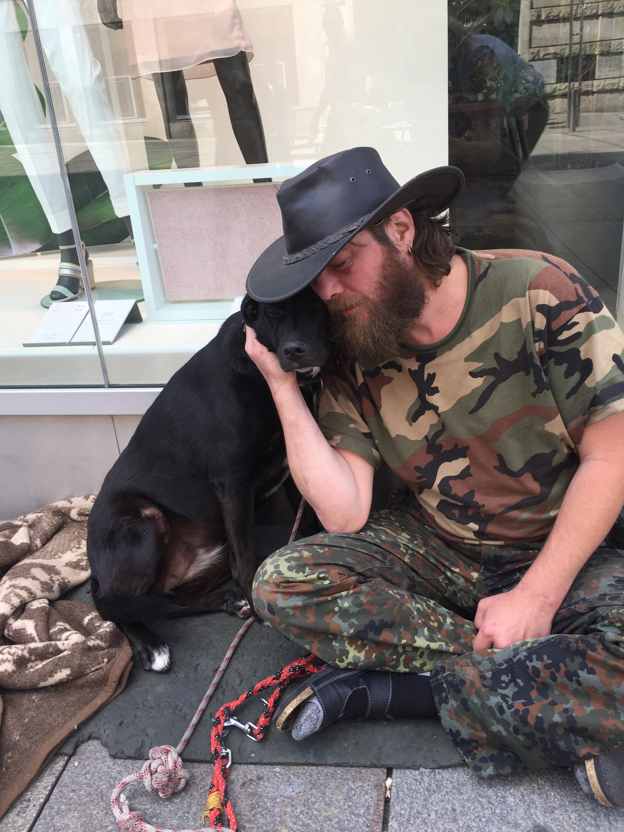We dont give money, we treat on the place. There are most of the time a “soup kithchen” for the people, and those I went to, their dog could also join them.
