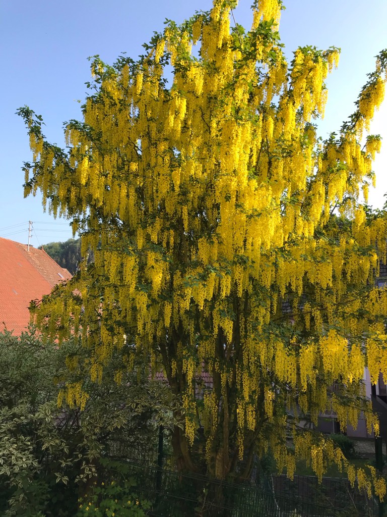 This morning I took my coffee, and went down to this magnificent tree in our garden. When the children were very small, they used to call this tree “the banana tree” Max, even tried to eat one of the yellow flowers.